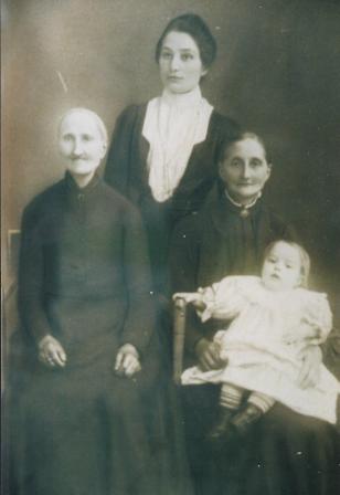 Min mor Eva i knät på sin mormor Blenda Jönsdotter. Till vänster hennes mor Brita Svensdotter - Heurlin. Längst bak min mormor Amanda. Kortet från ca 1906/1907 |
