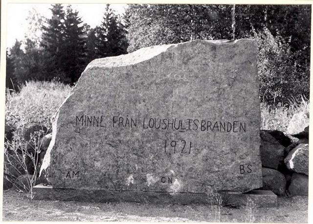 Minne från Loshultsbranden. Inskriptionen är utförd den 24 juli 1921 av militärer från A 3 i Kristianstad, som deltog i släckningsarbetet